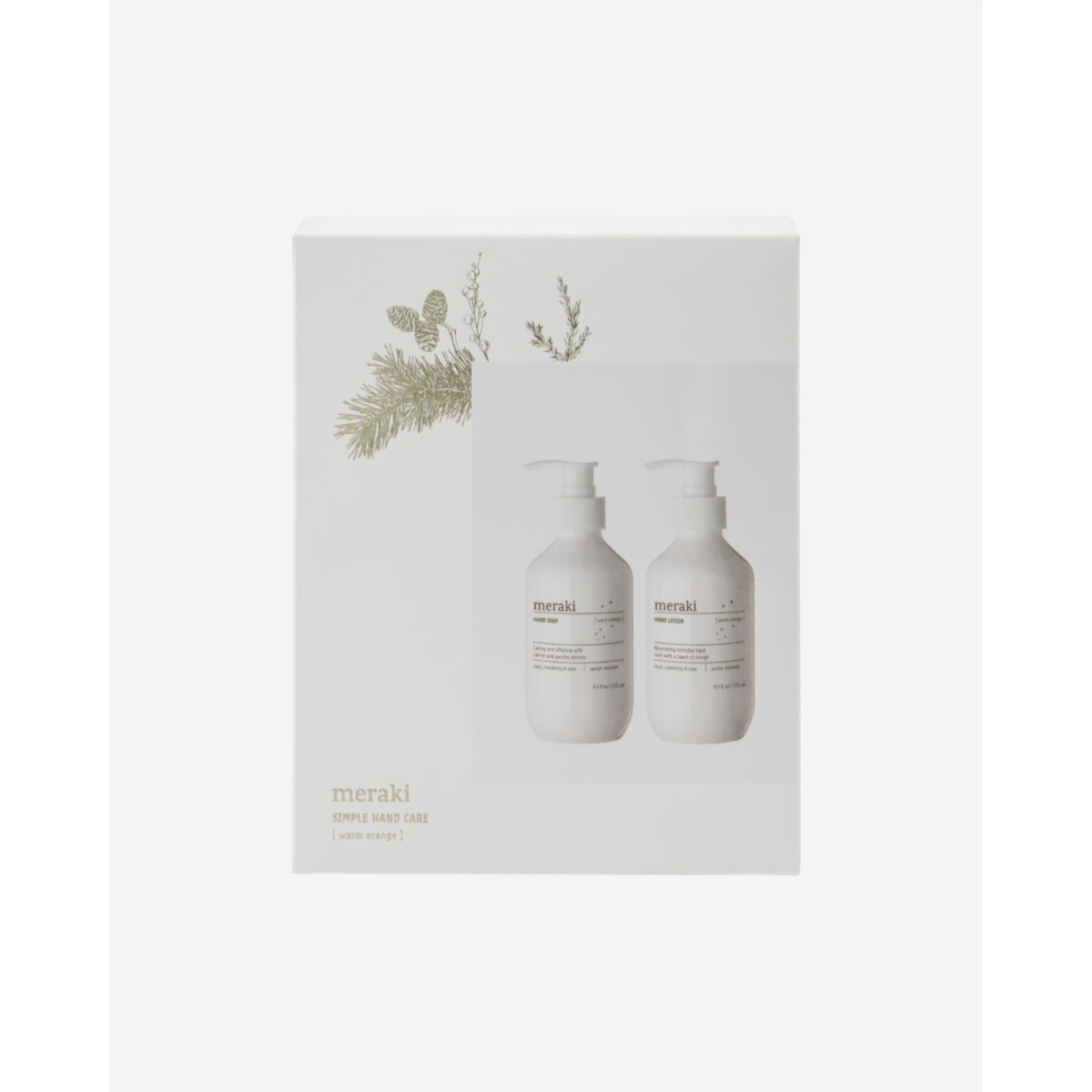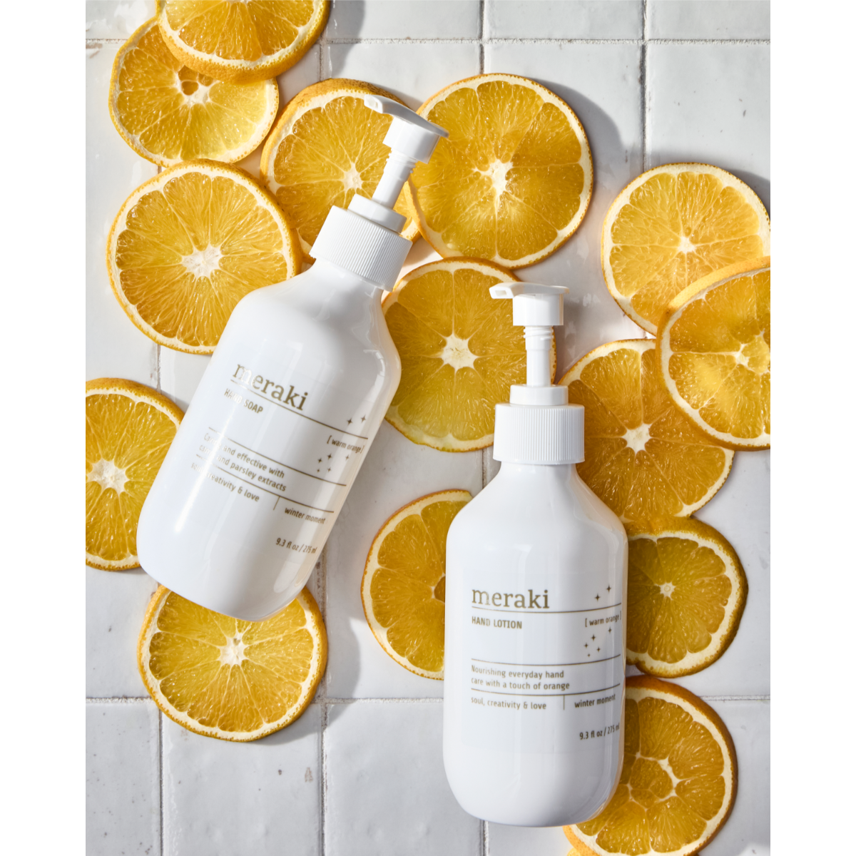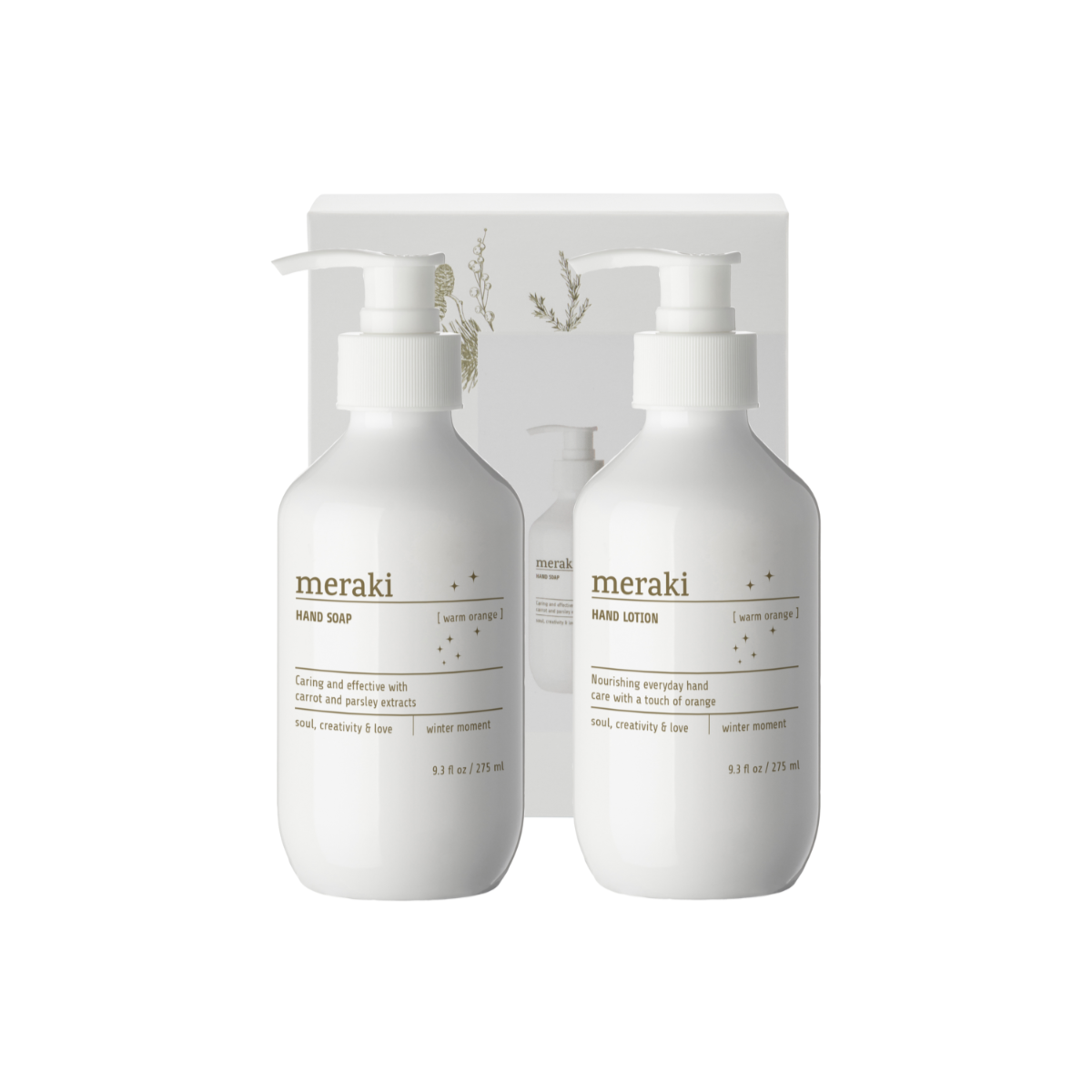 Inniheldur 275ml af Warm orange handsápu og 275ml af Warm orange handáburð